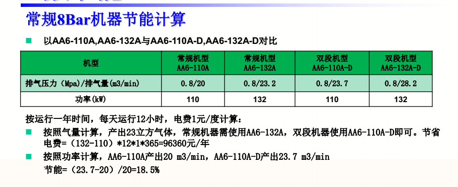 自然空氣通過空氣過濾器進入第一級壓縮,在壓縮腔與潤滑油混合,同時將混合氣體壓縮到級間壓力。壓縮后的氣體進入冷卻通道,與大量油霧接觸,從而降低了溫度。降溫后的壓縮氣體進入第二級壓縮,被壓縮到最終壓力,完成整個壓縮過程。 根據(jù)工程熱力學理論,溫度高的時候氣體的密度越低,壓縮需要用的功就越多,則空壓機在壓縮中定溫壓縮最省功。不僅如此,定溫壓縮不但可以減少消耗的功,還能降低壓縮后氣體的溫度,使空壓機材料的使用更為寬廣和經(jīng)濟,使空壓機的運行更為可靠。(但是定溫壓縮,就要使氣體熱量隨時與外界交換,氣體溫度與外界相等,在實際工作中是不可能實現(xiàn)的)另外,兩對轉子同時做功,打氣速度快,出氣量大,這點是單級無可替代的優(yōu)勢。而且由于雙級壓縮,每級的壓縮比較單極壓縮要小很多,轉子和軸承受到的壓力小,再加上轉子直徑大、轉速低,所以運行更可靠。